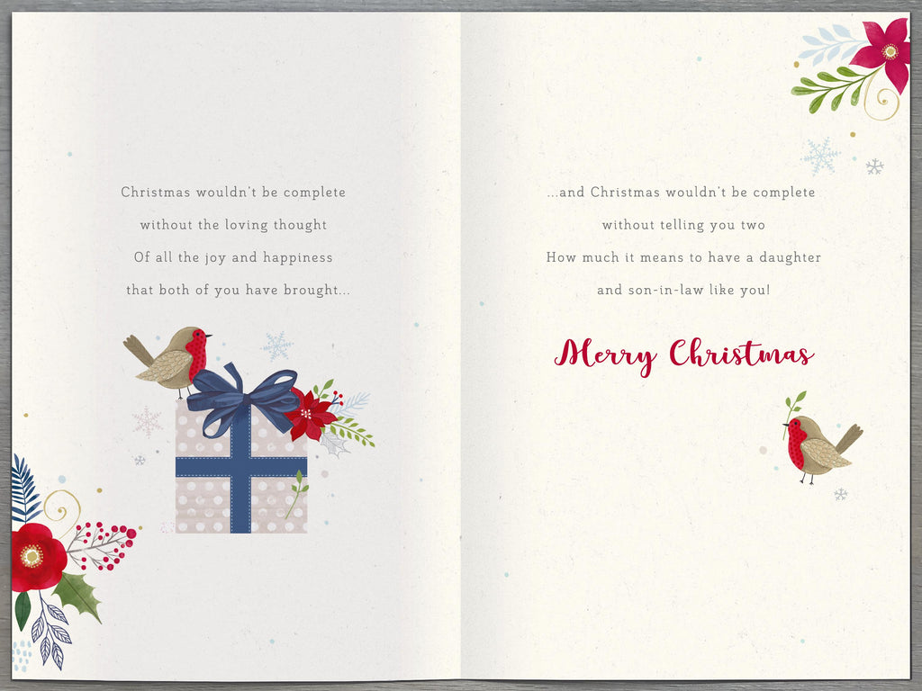 Celebrate the festive season with this charming Christmas card featuring a delightful robin perched on a present—perfect for your daughter and son-in-law. Its warm design conveys your heartfelt wishes, adding a special touch to their holiday celebrations. Send your love and joy with a card that will be treasured throughout the season.
