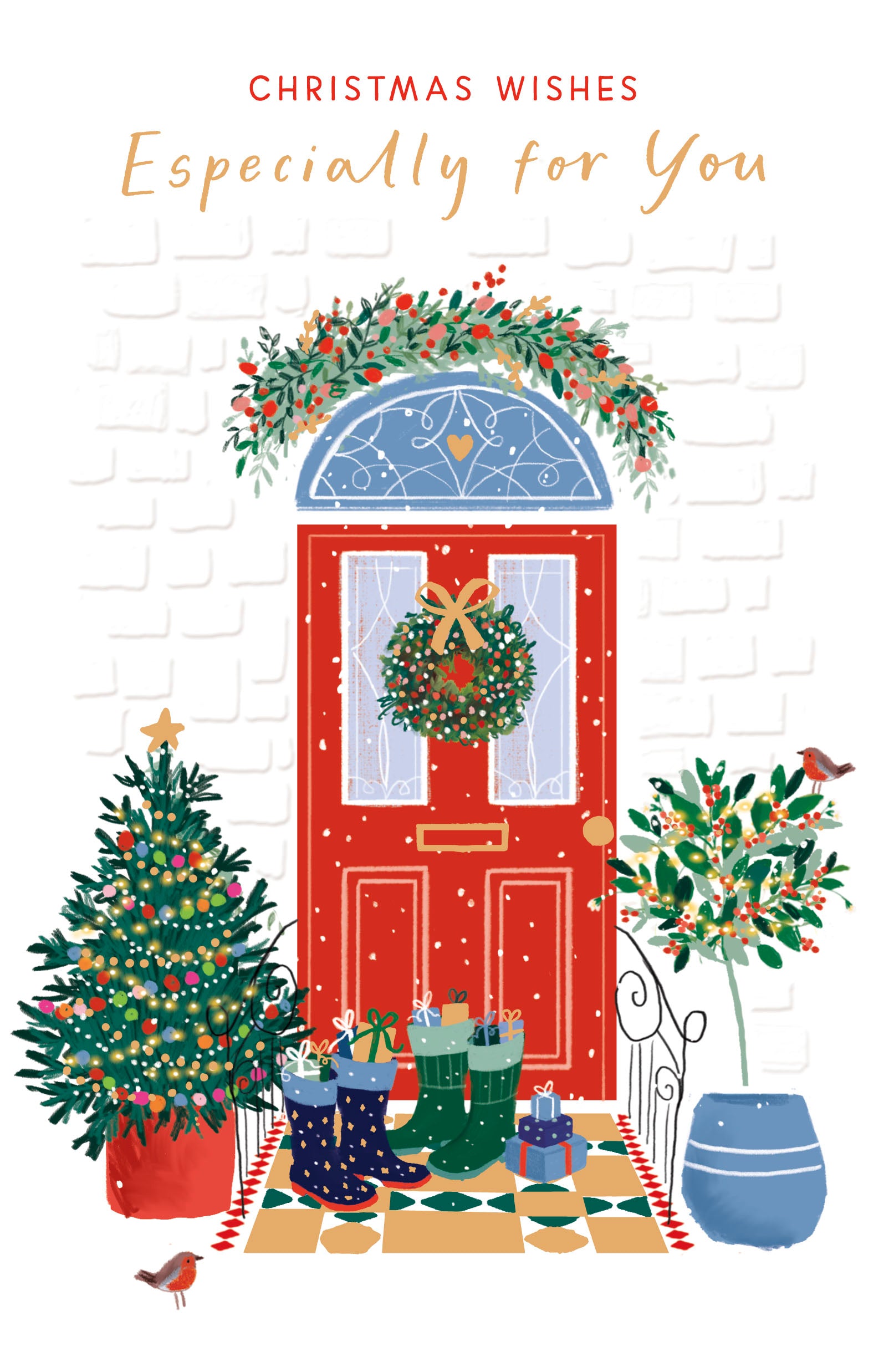 Celebrate the season with this charming Christmas card featuring a festive red door. Its warm and inviting design makes it perfect for spreading holiday cheer to friends and family. Share your heartfelt wishes with a card that captures the spirit of Christmas beautifully.