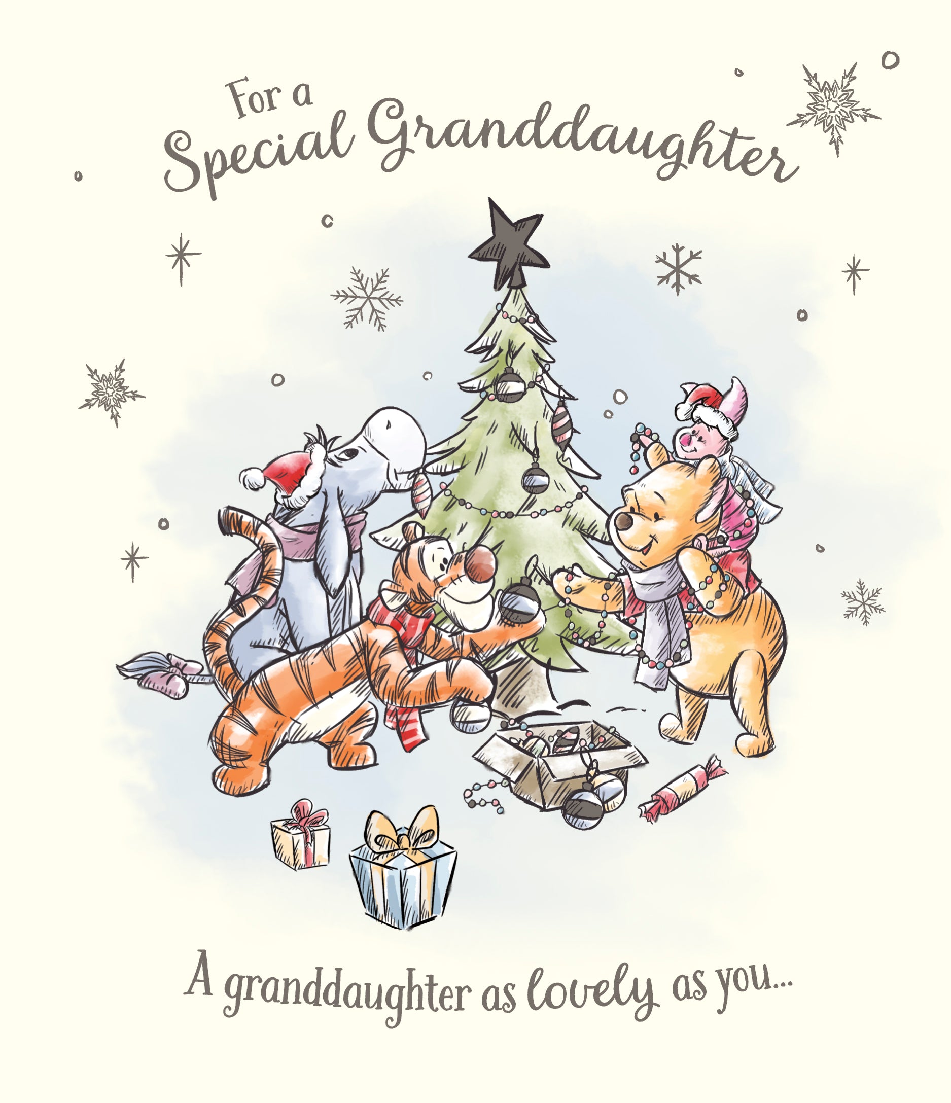 Celebrate the festive season with this charming Winnie The Pooh Christmas card, specially designed for your granddaughter. Featuring beloved characters that bring warmth and joy, it’s the perfect way to share your love and holiday wishes. Brighten her Christmas with a thoughtful message that captures the magic and happiness of this special time of year.