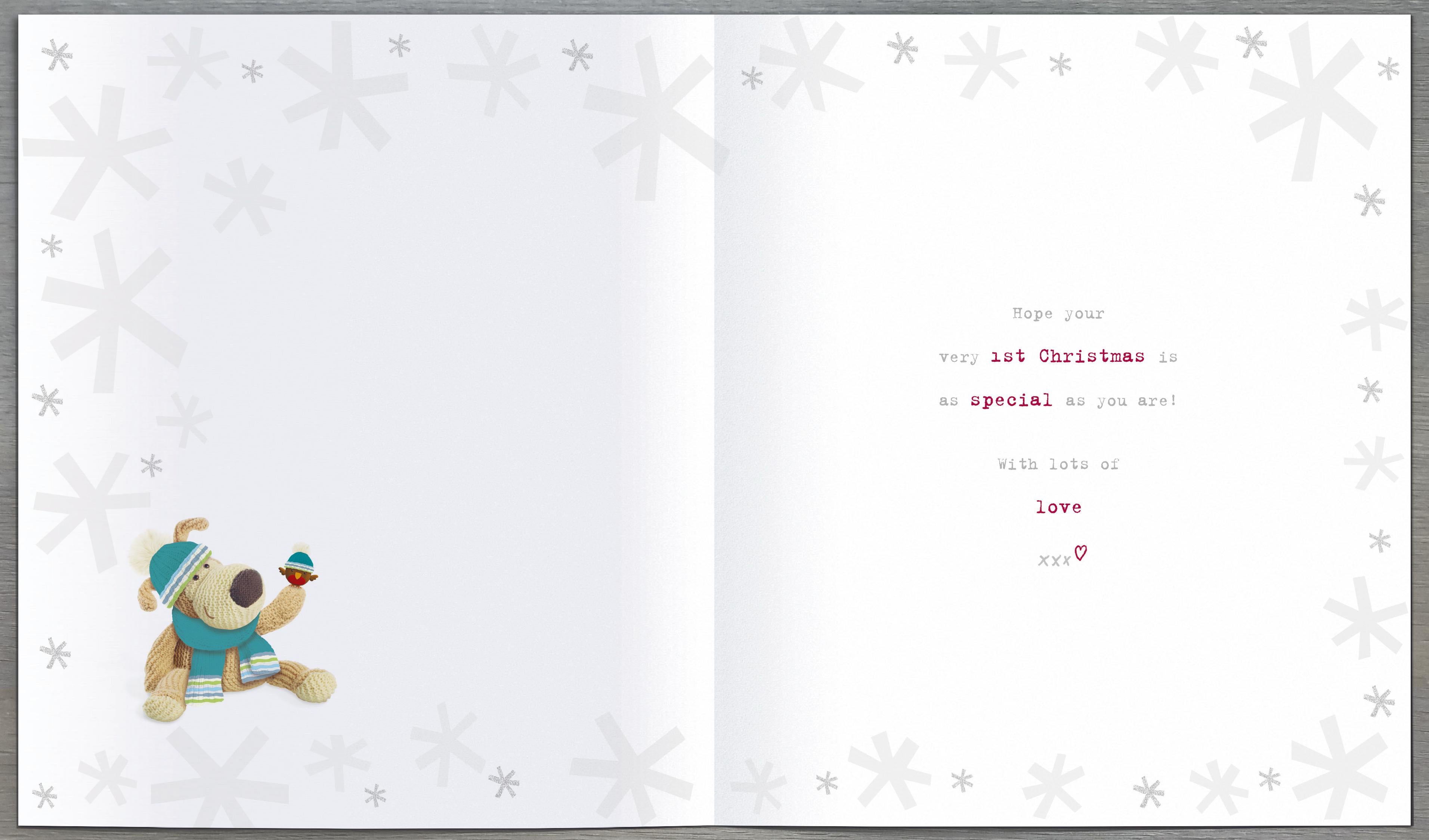 Celebrate a precious milestone with this charming "Baby's 1st Christmas - Boy" card featuring Boofle, the beloved character. Perfect for marking your little one’s very first festive season, this card combines warmth and sweetness to create a keepsake treasure. Share your joy and create lasting memories with a heartfelt message that captures the magic of this special time.