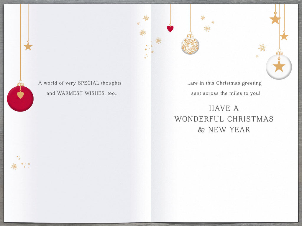 Send warm holiday wishes with the "Across The Miles - Baubles" Christmas card. Featuring festive bauble designs, this card beautifully conveys your heartfelt greetings to loved ones near and far. Perfect for bridging the distance and spreading seasonal cheer with style and sincerity.