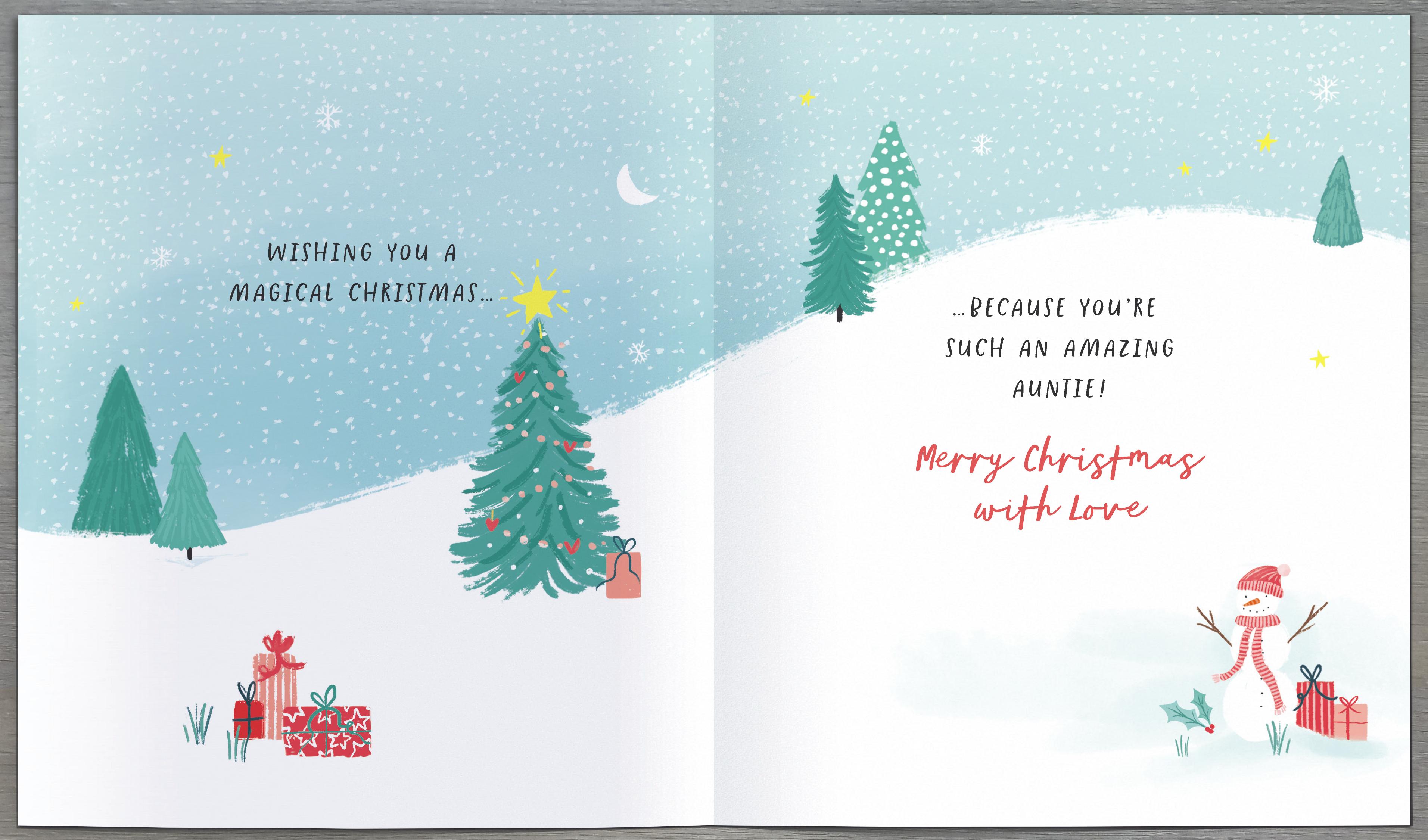 Celebrate the festive season with this charming Christmas card featuring adorable penguins gathered around a beautifully decorated tree. Perfect for your auntie, this card brings warmth and joy, making holiday wishes extra special. Its delightful design is sure to brighten her day and show how much you care. Share the magic of Christmas with this unique and heartwarming greeting.