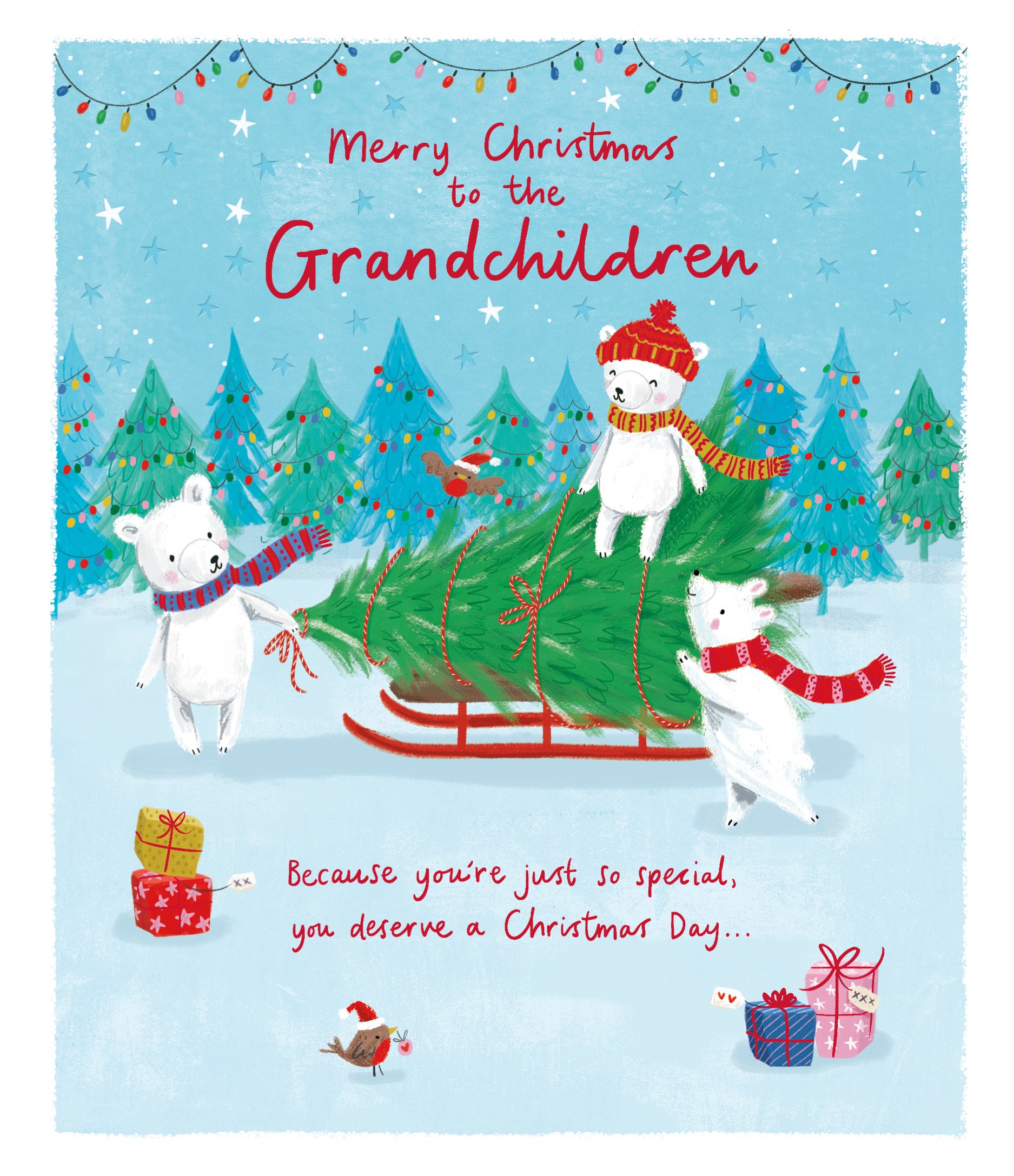 Celebrate the magic of the holidays with this charming Christmas card featuring a festive tree on a sleigh—perfect for grandchildren. Its warm, joyful design brings holiday cheer straight to their hearts, making your seasonal wishes memorable and special. Send your love wrapped in this delightful card to brighten their festive season.