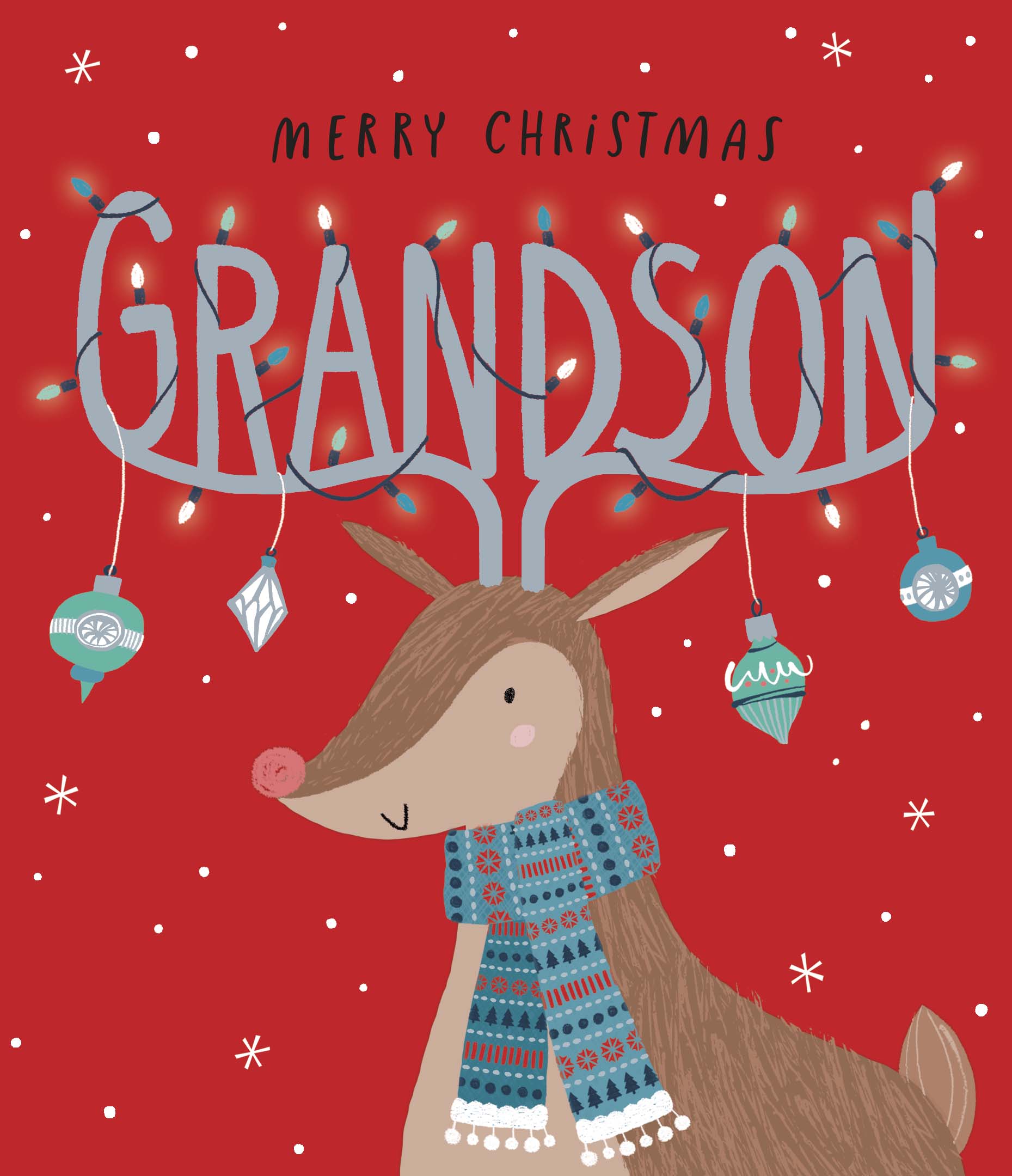 Celebrate the festive season with this charming Christmas card designed especially for your grandson. Featuring playful Rudolph horns, it adds a touch of holiday magic and warmth to your heartfelt message. Perfect for spreading joy and making your grandson feel truly special this Christmas.