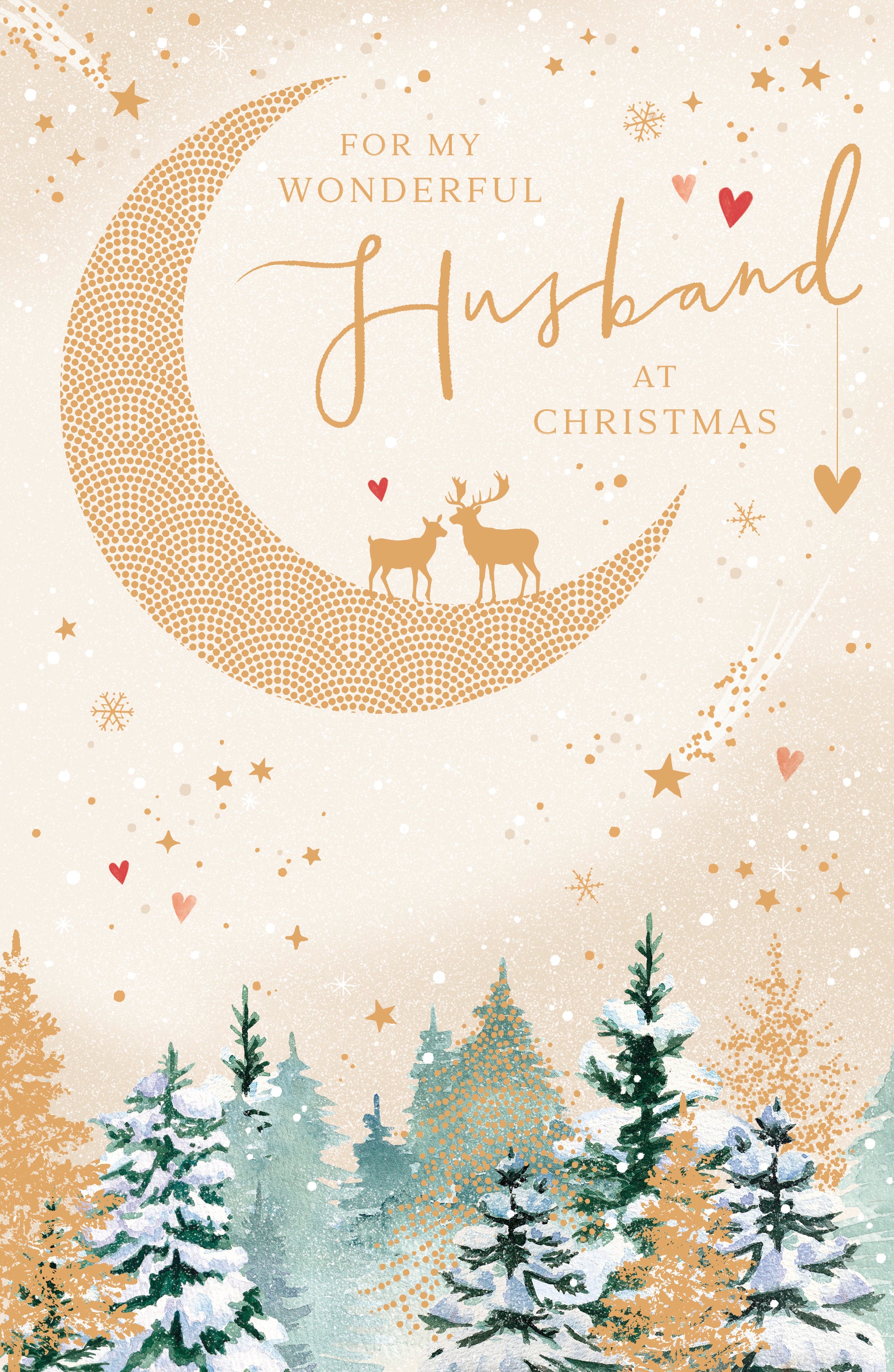 Celebrate the magic of the season with this elegant Gold Moon Christmas card, designed especially for your husband. Its shimmering gold moon detail captures the warmth and love you share, making your holiday message truly memorable. Perfect for expressing heartfelt wishes, this card brings a touch of festive charm and personal sentiment to your Christmas greetings. Show him how much he means to you this holiday—send a card as special as your bond.