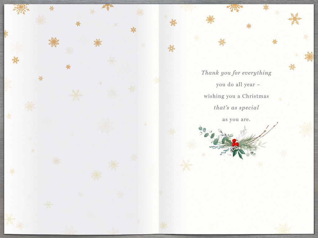 Celebrate the festive season with this beautifully designed Christmas card, specially crafted for Mum. Featuring elegant foliage artwork, its warm and heartfelt wording perfectly expresses your love and appreciation. Send a charming message that will brighten her holiday and remind her how much she means to you. Ideal for adding a personal touch to your Christmas celebration.