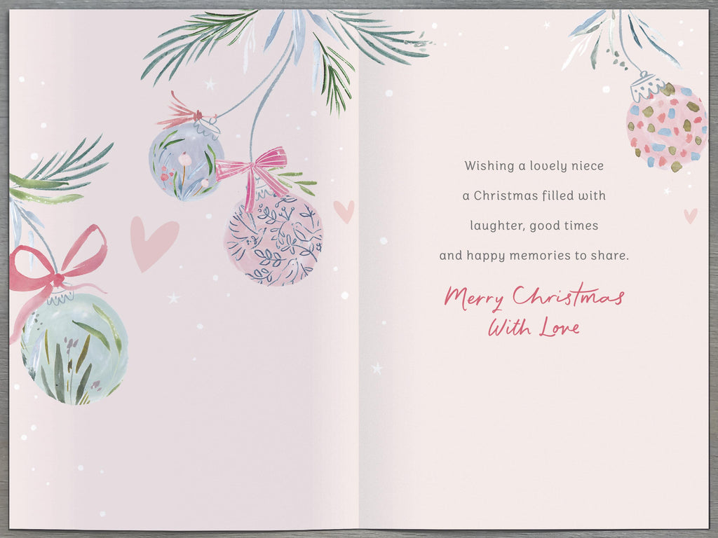Celebrate the festive season with this charming Christmas card designed especially for your niece. Featuring delicate pastel baubles, it combines elegance and warmth to convey your heartfelt holiday wishes. Its soft colors and thoughtful design make it a perfect keepsake that she’ll cherish year after year. Send joy and love this Christmas with a card as special as your bond.