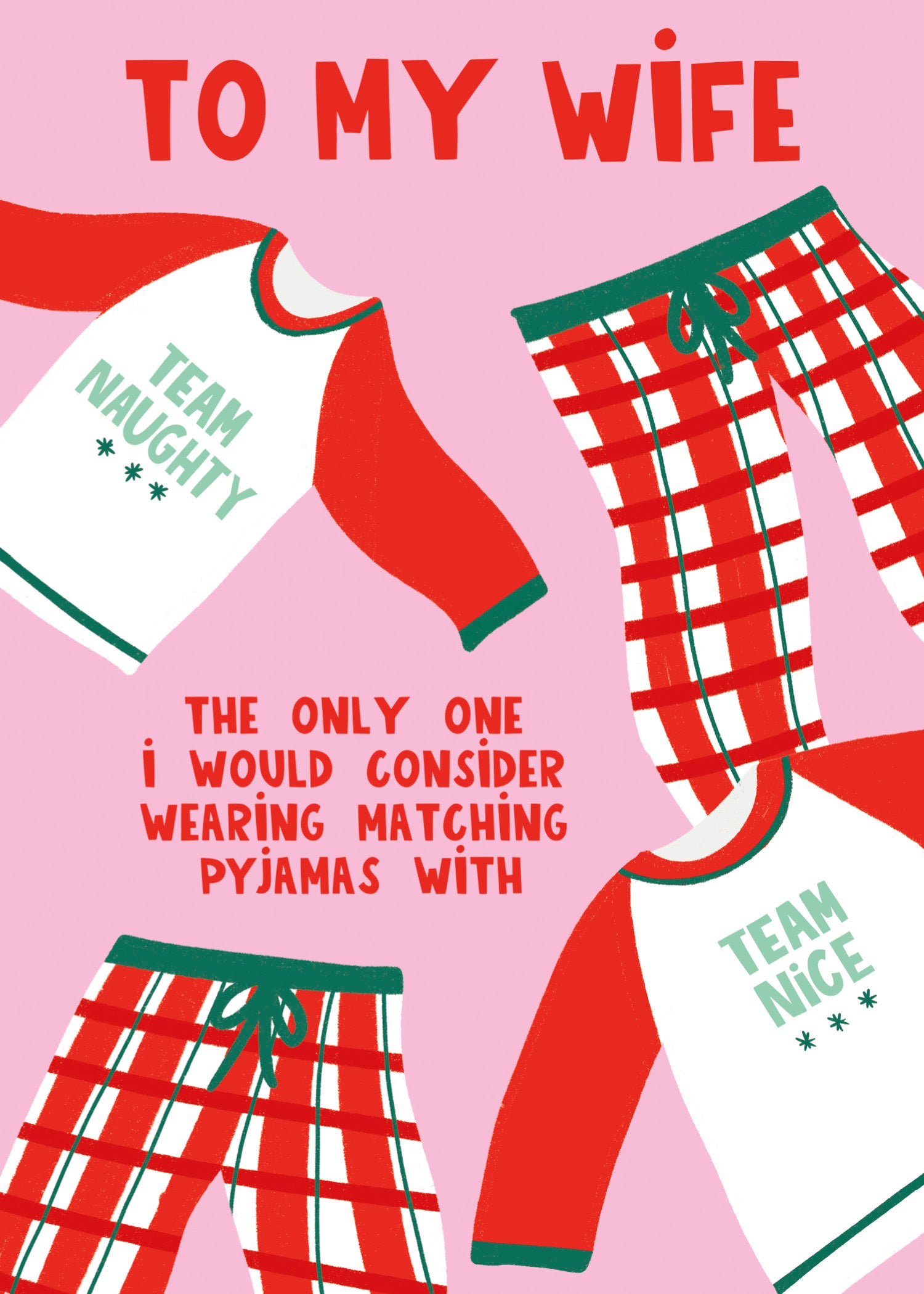 Celebrate the festive season with this charming Christmas card designed especially for your wife. Featuring a delightful matching pajamas theme, it perfectly captures the warmth and joy of holiday togetherness. Send your love with a card that adds a personal, cozy touch to your Christmas greetings.
