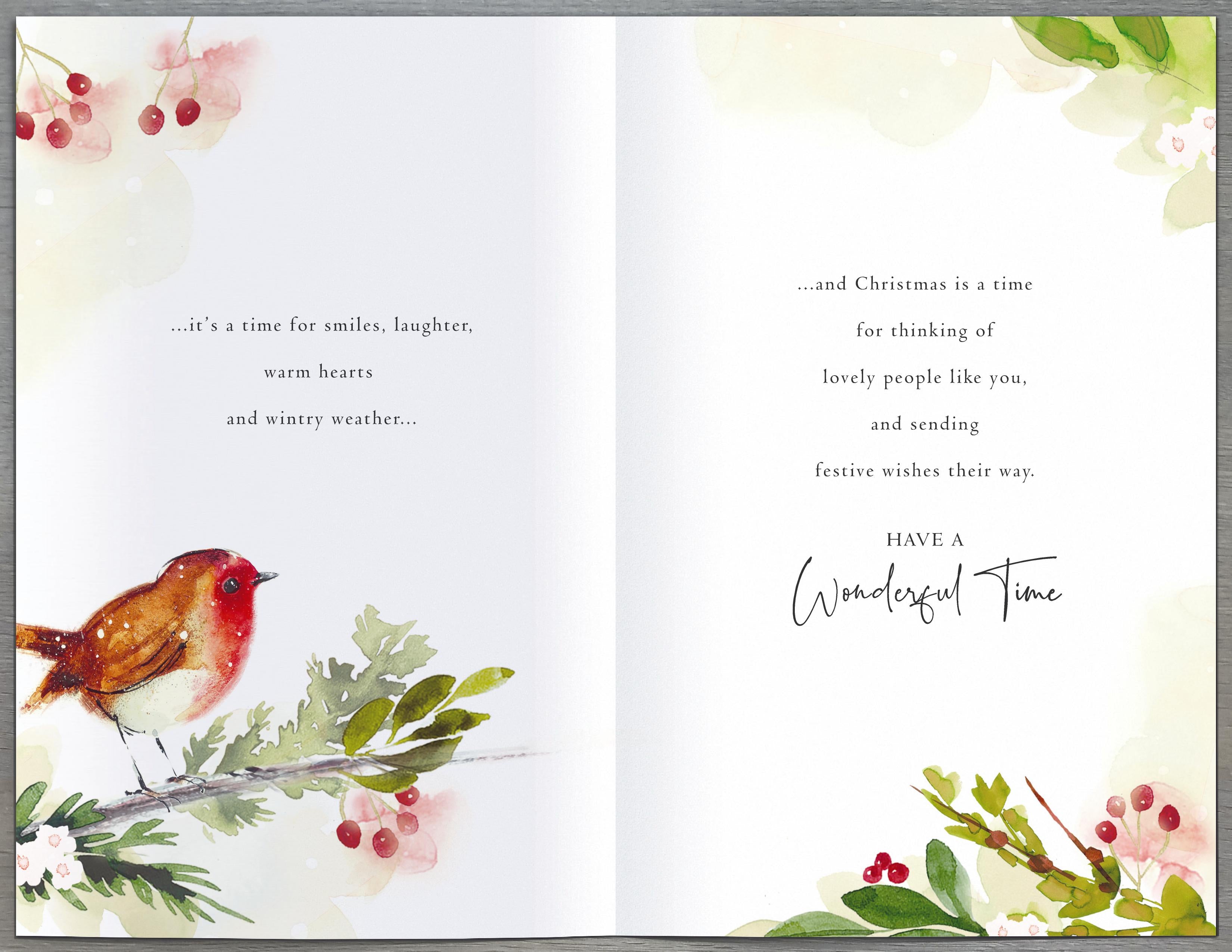 Celebrate the festive season with this charming Christmas card featuring a delightful robin perched on a branch. Its classic design and warm imagery make it the perfect way to send heartfelt holiday wishes to family and friends. Crafted with quality materials, this card ensures your message is shared with a touch of seasonal cheer and elegance. Make your greetings memorable with this timeless festive card.