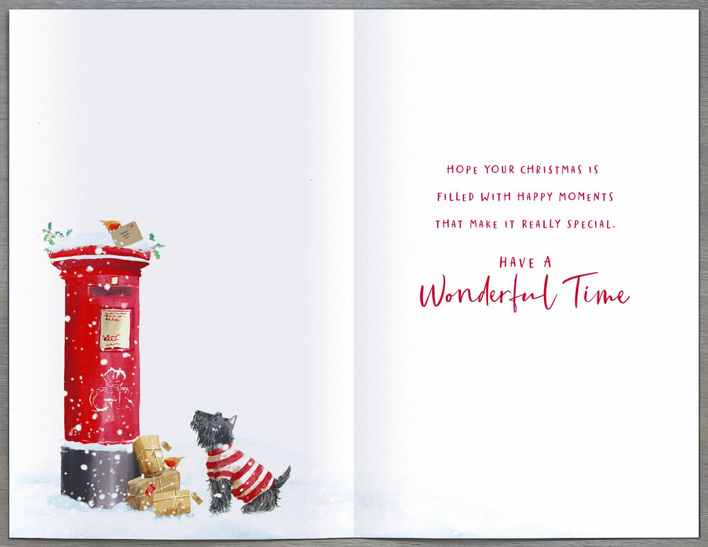 Celebrate the festive season with the charming "Scottie At The Postbox" Christmas card. Featuring a delightful Scottie dog by a classic postbox, this card brings warmth and cheer to your holiday greetings. Perfect for sending heartfelt wishes to friends and family, its timeless design captures the spirit of Christmas in a unique and memorable way. Make your messages stand out with this endearing card that spreads joy and festive spirit effortlessly.