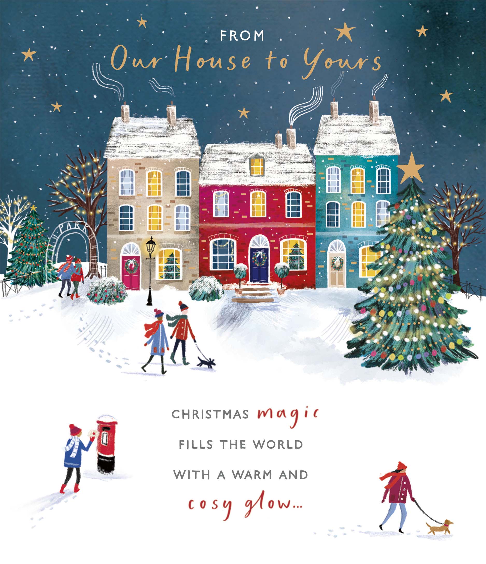 Capture the warmth of the holiday season with this charming Christmas card featuring a festive street scene. Perfect for spreading cheer from house to house, it conveys heartfelt wishes and adds a personal touch to your seasonal greetings. Brighten someone’s day with a simple, beautiful card that celebrates community and the joy of Christmas.