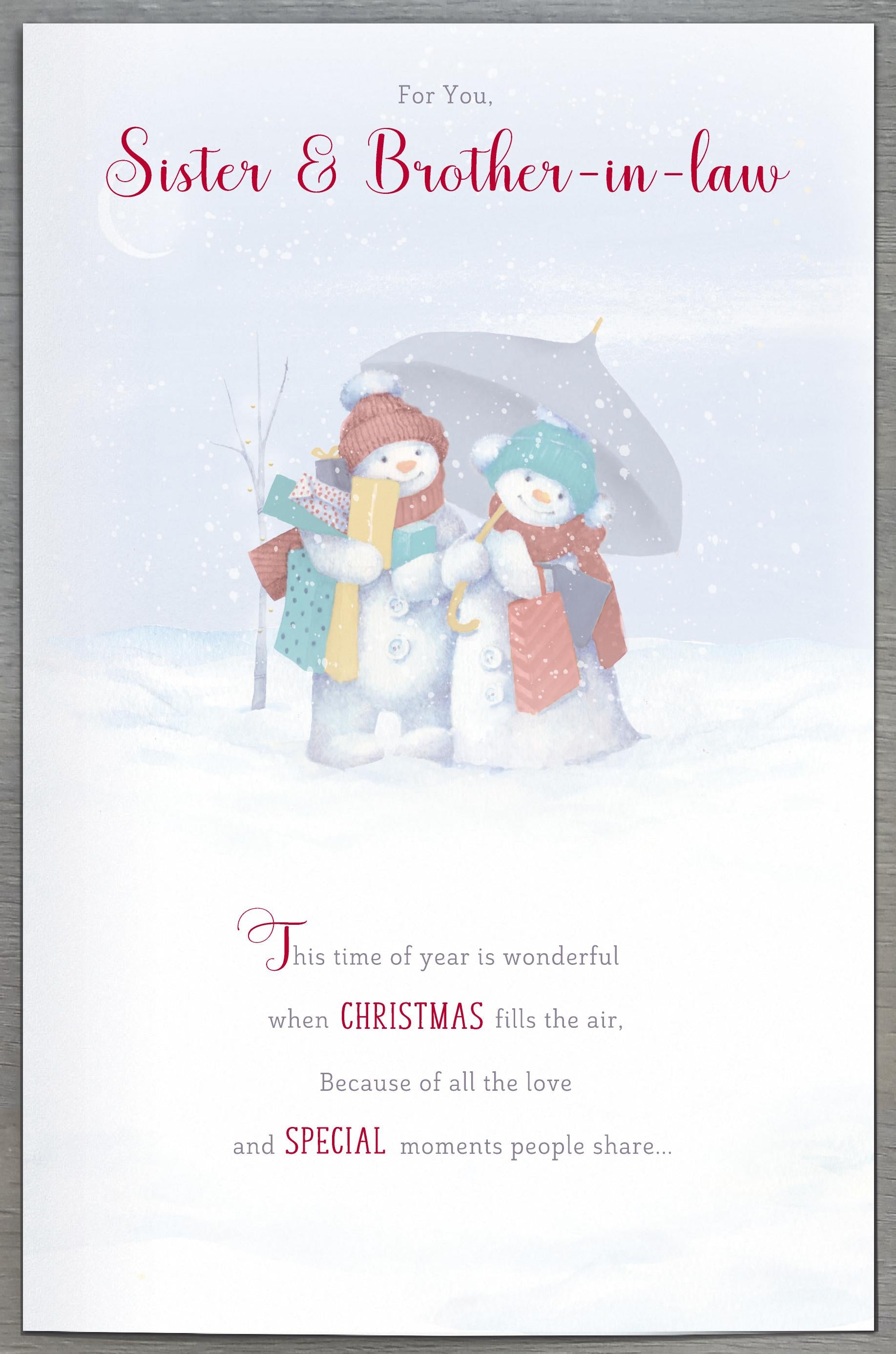 Celebrate the festive season with this charming Christmas card featuring a delightful snowman couple, perfect for your sister and brother-in-law. Its warm design conveys heartfelt wishes, making it an ideal way to share joy and love. Crafted to brighten their holiday, this card adds a personal touch that shows how much you care.