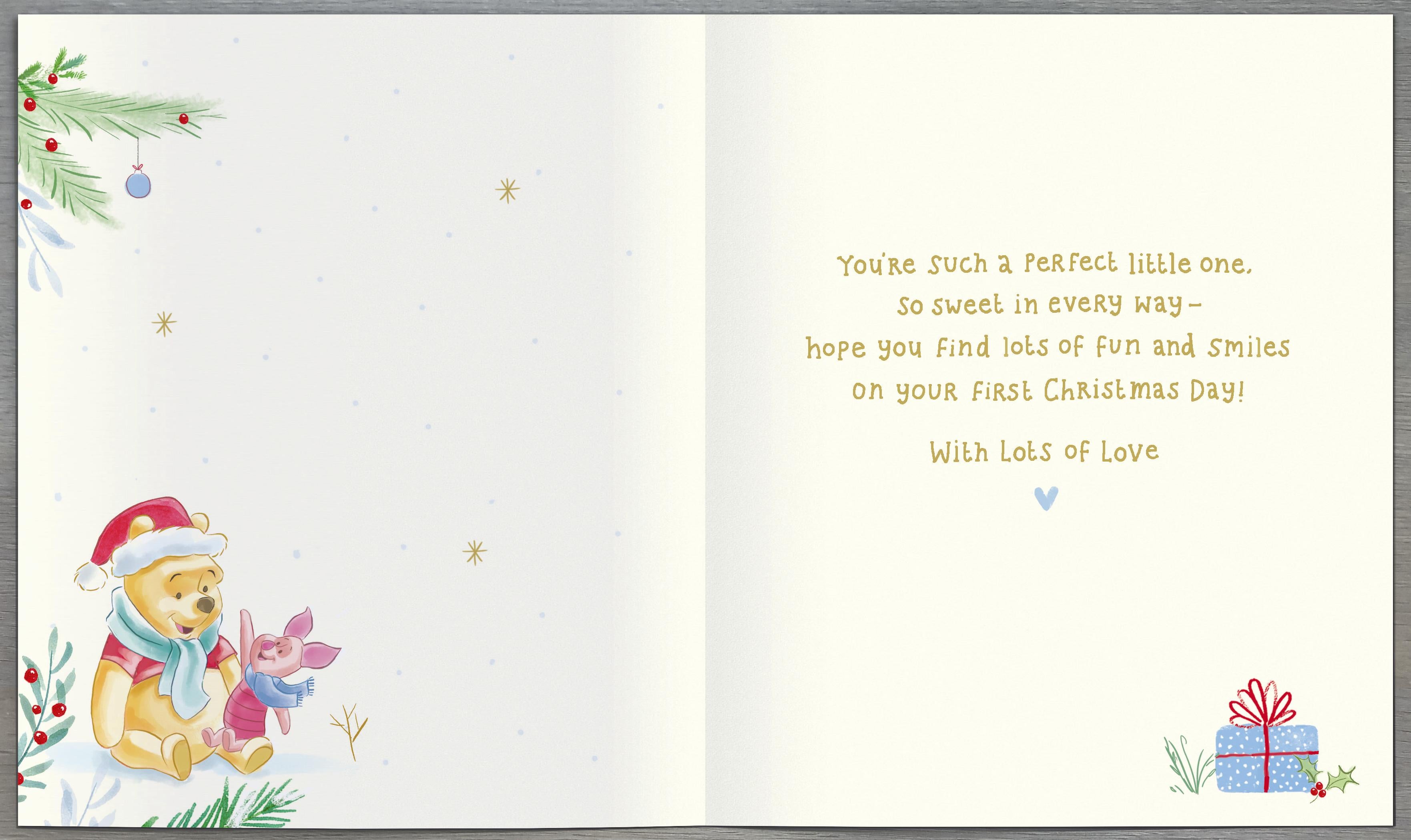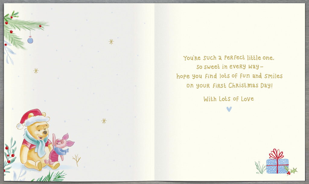 Celebrate your son's very first Christmas with this charming Winnie the Pooh card. Featuring beloved characters, it adds a warm, nostalgic touch to your holiday greetings. Perfect for creating lasting memories and showing your little one how special this milestone is.
