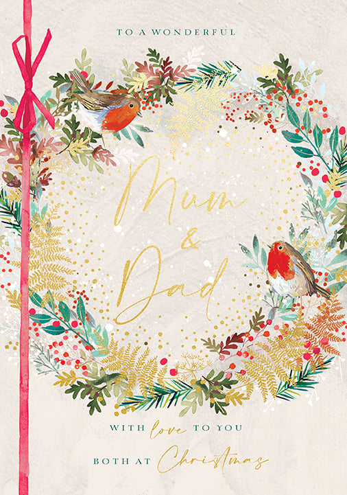 Christmas Card, Mum & Dad - Robins And Wreath