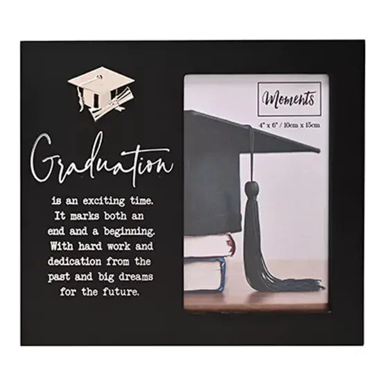 An MDF with matt finish ‘Graduation’ photo frame from Moments by CELEBRATIONS®, with an aperture measuring 4" x 6". This black frame is embellished with a petite, silver coloured graduation cap and scroll. It is accompanied with attractive wording which features a life-affirming message. This freestanding frame will look great on display in any home and is perfect for displaying a photograph from the special day. Comes packaged in grey colour box.