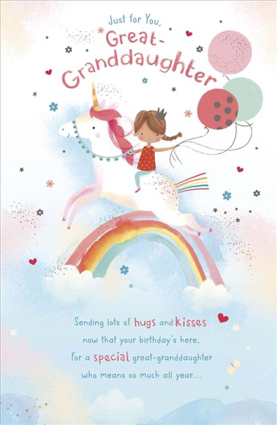 A magical birthday card for your Great Granddaughter featuring a delightful unicorn and rainbow design.