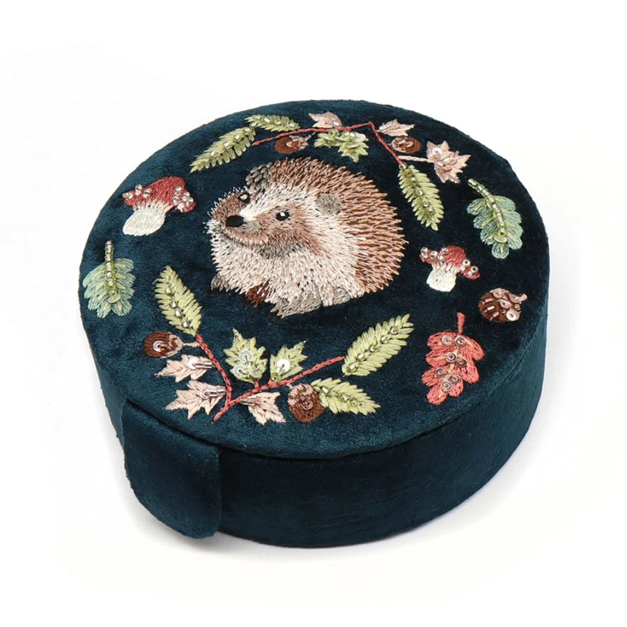 Embroidered Jewellery Box - Dark Teal Velvet With Hedgehog And Autumnal Leaves