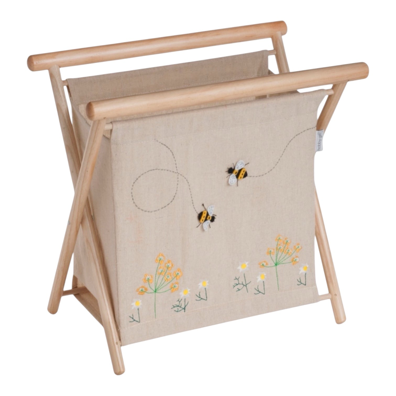 Collapsible knit-sew made from cotton fabric on wooden frame. Appliqué design. Internal see through plastic storage pocket. Perfect for storing knitting and sewing projects.