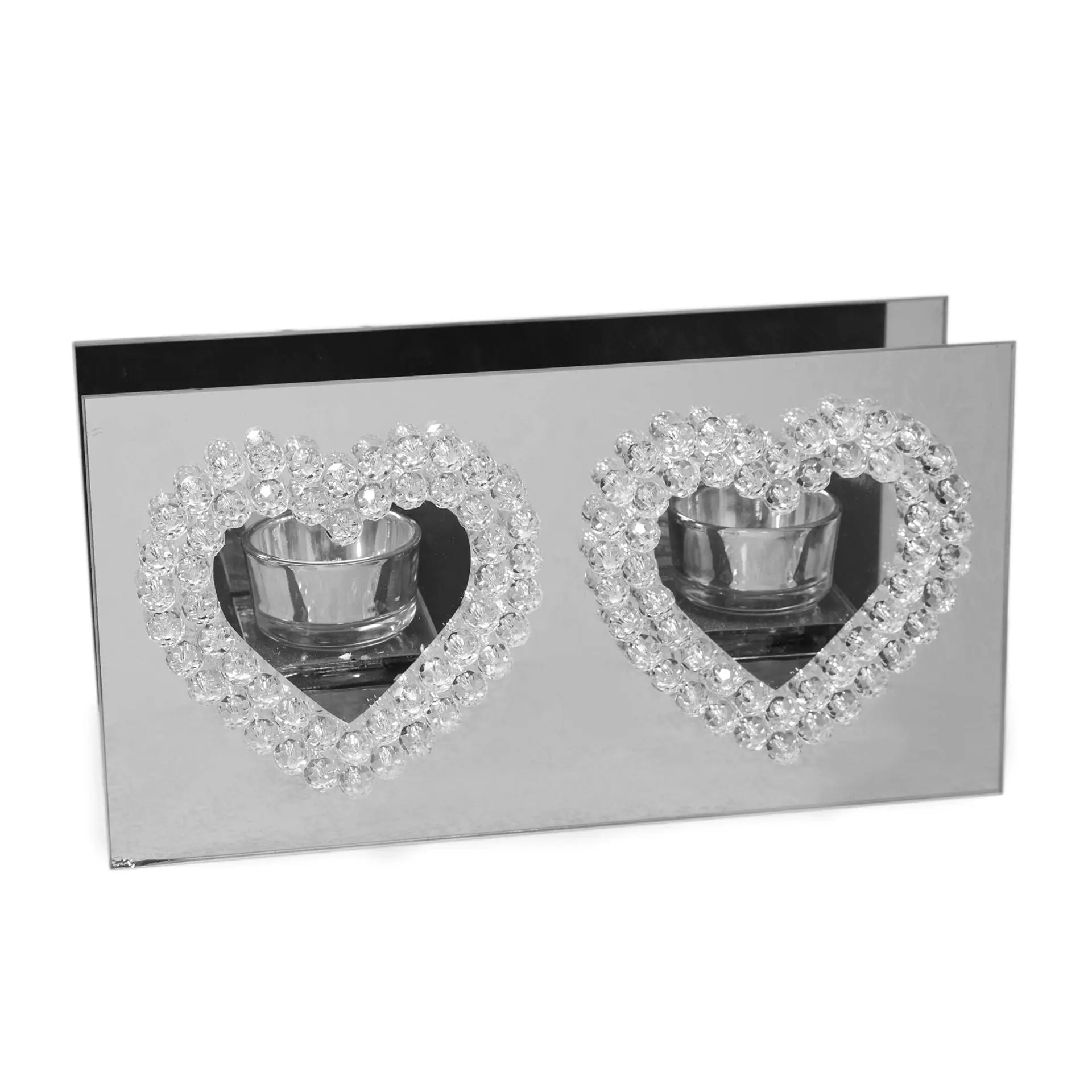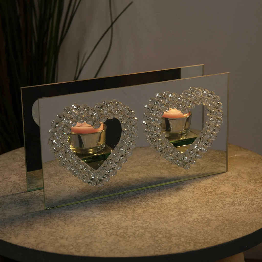 Illuminate your space with the stunning Hestia Mirror Glass Double Tea Light Holder. Featuring mirrored silver glass for optimal light reflection and faceted crystal bead heart windows, this holder adds an elegant touch to any modern home. Includes 2 tealight holder cups for a warm and inviting ambiance.