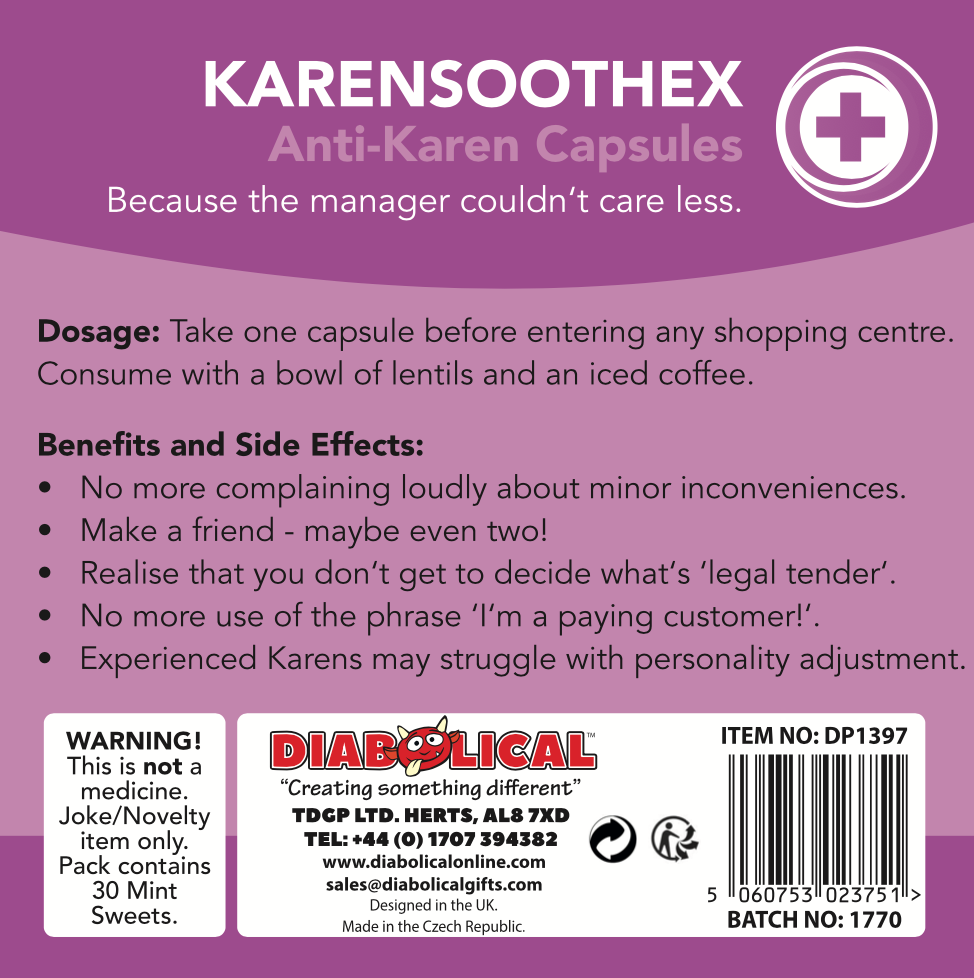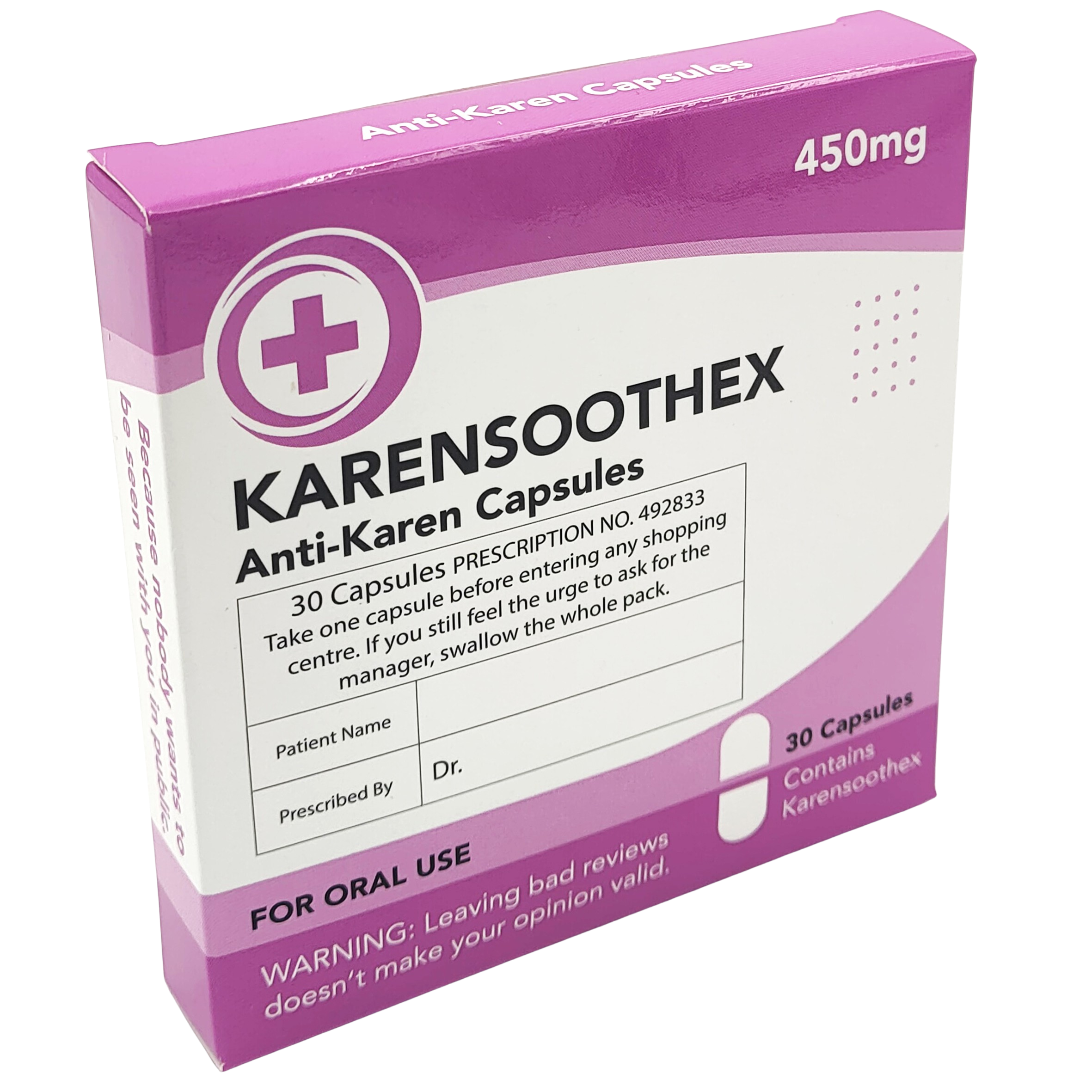Karensoothex is the perfect novelty gift for anyone who knows a Karen—or might just be one themselves! These hilarious prescription mint pills offer a tongue-in-cheek solution for those infamous “Can I speak to the manager?” moments. Packaged to resemble a genuine prescription medication box, Karensoothex delivers both laughter and refreshingly minty relief. Inside, you’ll find blister packs filled with high-quality mints that are as fresh as the humor they bring.