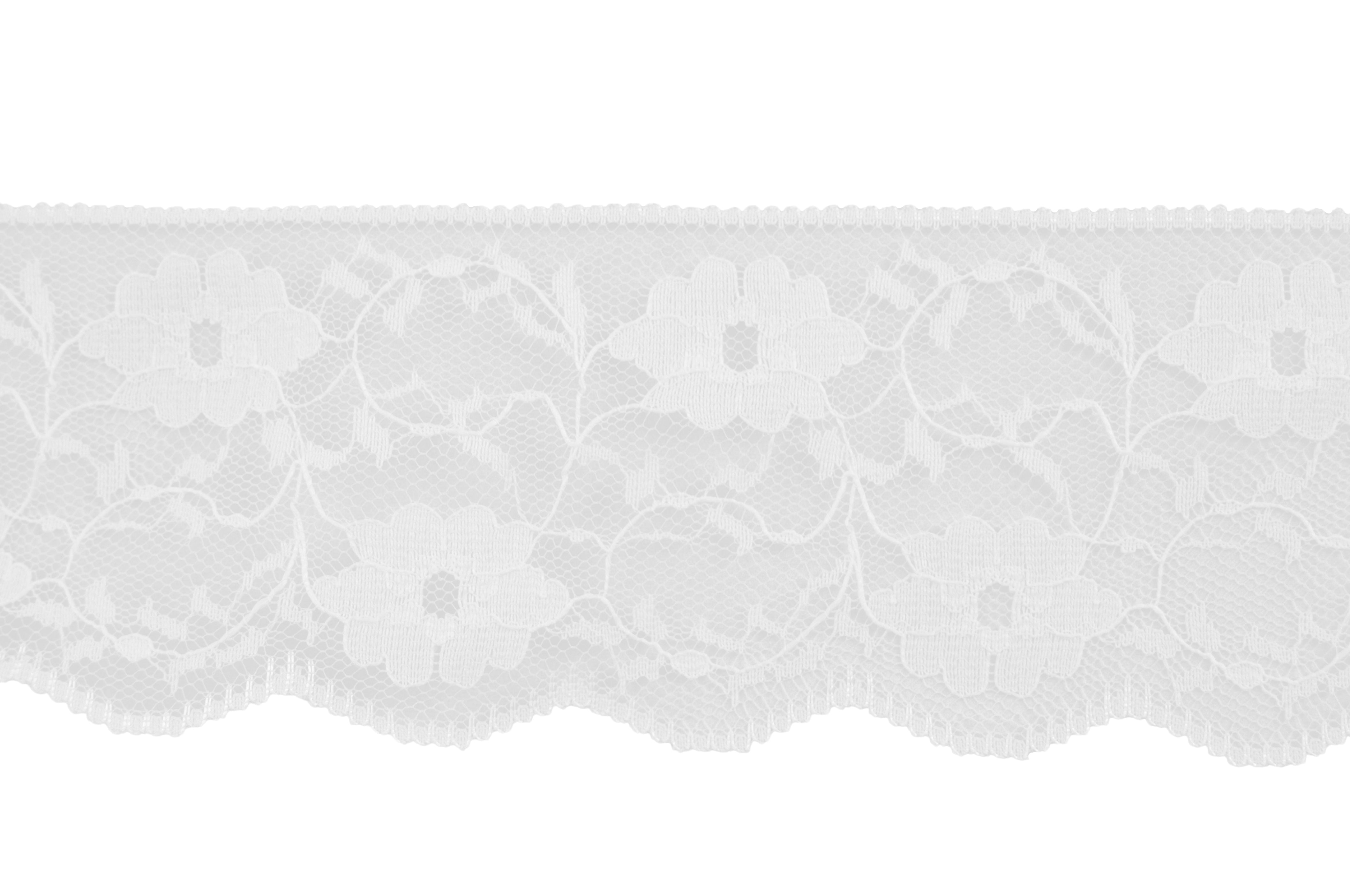 This elegant ivory lace trim features two rows of delicate flowers connected by graceful ivy, creating a beautifully transparent design that lets your background fabric shine through. Perfect for adding a refined touch to garments or craft projects, it combines style with versatility. Easy to care for with gentle washing and ironing instructions, this nylon lace is sold by the metre, making it ideal for customisation and creative expression. Elevate your creations with this exquisite lace trim.