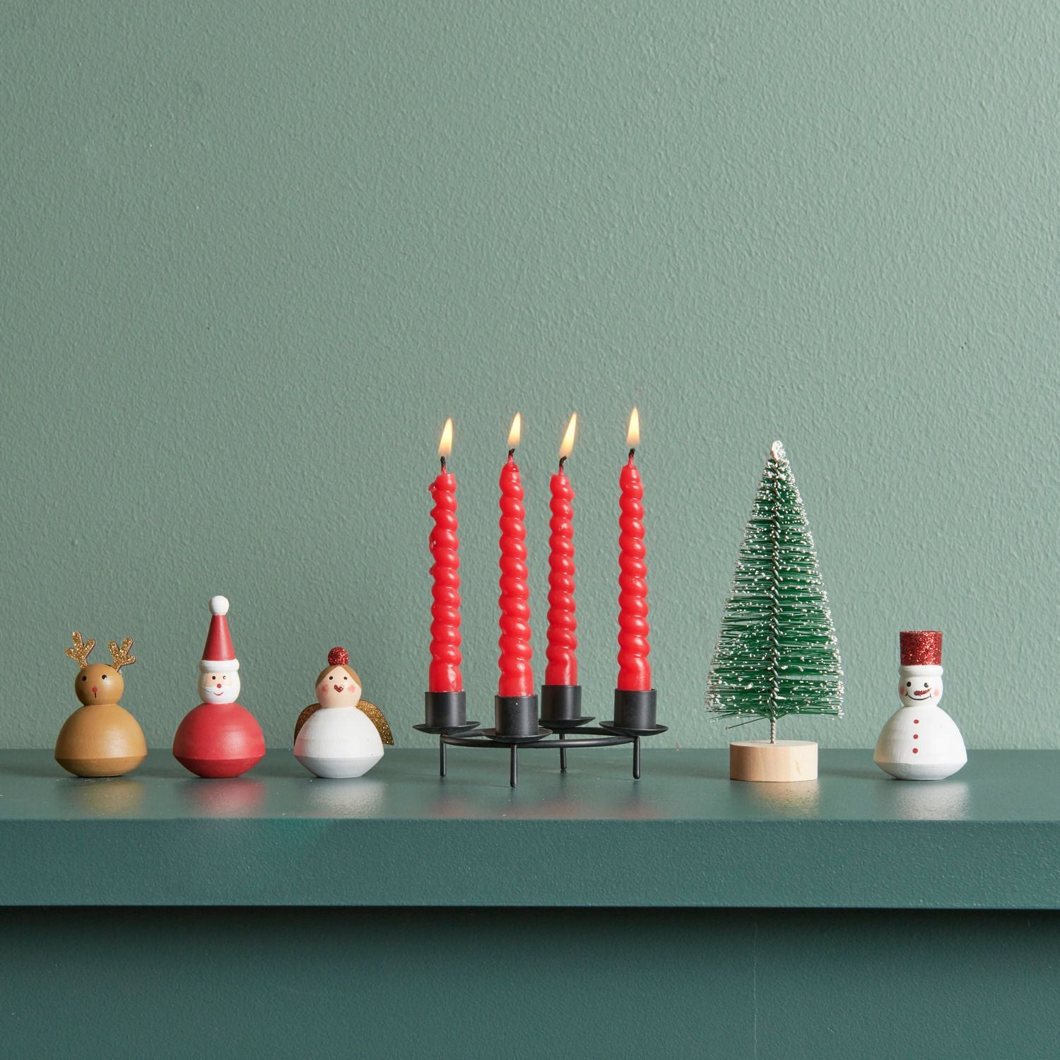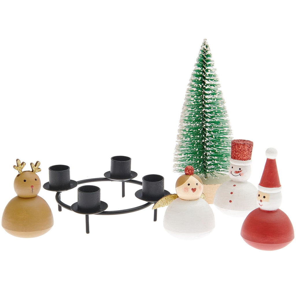 This mini Advent wreath decoration adds a cozy, festive touch to your home. Crafted in anthracite metal, it holds four candles with a 1.3 cm diameter, perfect for lighting up your Advent celebrations. Adorned with charming wooden Christmas figures and a small artificial fir tree, it brings a warm, seasonal atmosphere to any table or windowsill. Ideal for enhancing your holiday décor, this set offers everything except the candles, allowing you to customize and brighten your space with ease.
