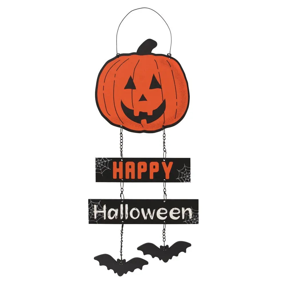 Get ready for a spooktacular Halloween with the Happy Halloween Pumpkin Sign! Featuring a carved pumpkin design, bats, and festive banners with the text "Happy Halloween," this hanging sign is the perfect addition to your Halloween decor. Hang it on your door or wall to add a cheerful touch to your Halloween gathering.