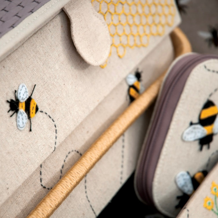 Extra large novelty sewing box with drawer. Made from linen fabric with a raffia-effect handle. The box is shaped like a Beehive and is decorated with bee appliqué and embroidered designs. Hard plastic internal tray with compartments for sewing accessories.
